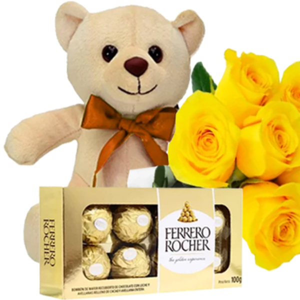 Arranjo de Rosas Amarelas com Pelúcia e Chocolate