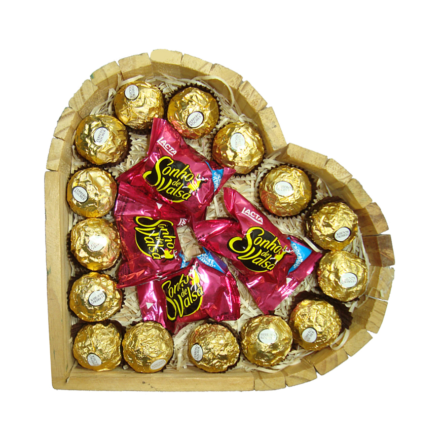 Rosas Vermelhas e cor de Rosa, Coração de Madeira, Ferrero Rocher, Sonho de Valsa, Celofane, papel kraft, Laço decorativo e Caixa para viagem.
