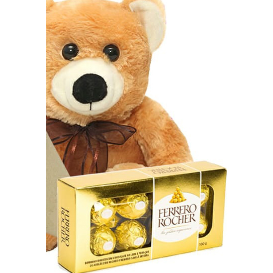Girassol, Pelúcia, Ferrero Rocher com 8 unidades, Celofane, Laço decorativo e Caixa para viagem.